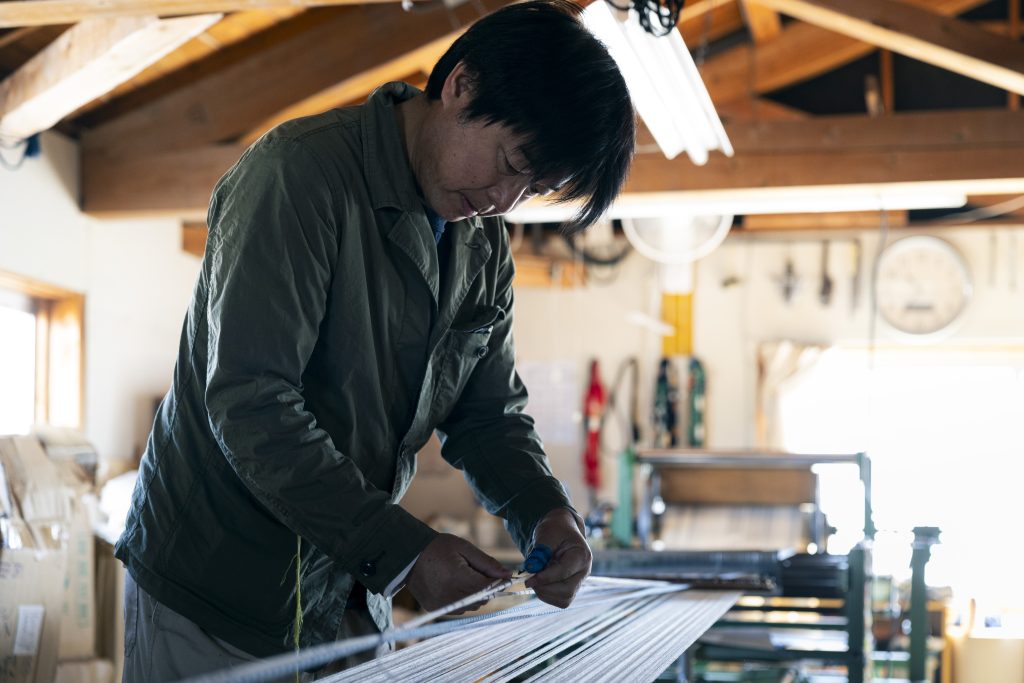 こうしたさまざまな創意工夫を盛り込んだ経絣を生み出すため、久保かすり織物では通常は1反(約12m)を1日かけて巻くところを、2〜3日かけてとにかく丁寧に行っている。また、久保かすり織物では、荒巻だけではなく織りの工程でも、織機を調整して経糸を上下にずらして軌道を変えることで柄に変化をつけることもあるという。こうした経糸へのこだわりが、久留米絣業界でも「経絣の久保さん」と言われるほど、柄の細かさや美しさに定評がある所以なのだ。