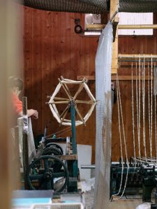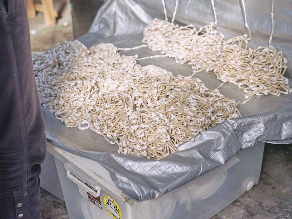 経糸の括りも、織元が持ち込む図案をもとに、括りのピッチを計算して機械に入力しなければならない。括るために使う綿糸は、手作業で小麦粉をつかった糊に浸しボビンに巻きつける。括りを間違えば、生地の模様に影響が出てしまうため、丁寧に進める必要のある責任重大な仕事なのだ。