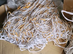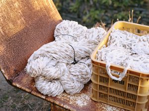 しかし機械といっても、人間のサポートを大いに必要とするものなので、実際に実用レベルまでに稼働するまでの調整はなかなか大変で、試作や実験段階では大量の括り糸のロスも出る。生地を完成形として見る絣産地では、これまでこうした余り糸に価値が見出されることはなかった。
