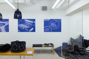 坂田織物の3代目である坂田和生さんにとって、そんな固定概念を変えてくれたきっかけが、2023年に東京で開催された「I/KAT 久留米絣の可能性」展だったという。久留米絣産地の広域的な取り組みの一環で、デザイナーの飯田将平氏をクリエイティブディレクターに迎えたプロジェクト。テキスタイルとしての久留米絣ではなく、布になる前のプロセスに着目し、括り糸・残糸などを活用したプロダクト試作などが展示された。
